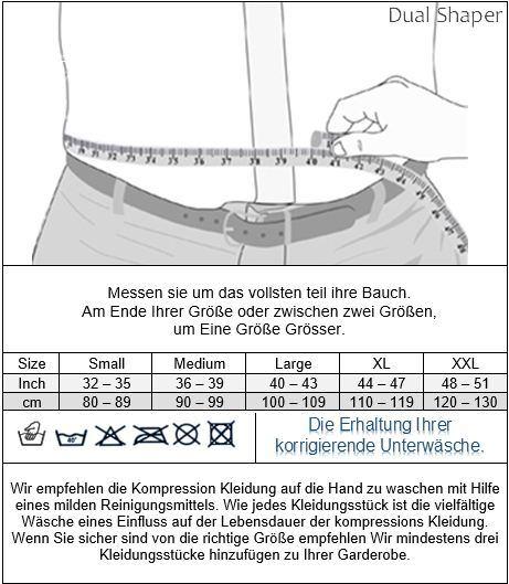 Die Dual Shaper ist eine extra starke Figur formendes Shirt für Männer. Diese Shapewear Unterhemd ist mit einer zweischichtigen Rückseite verstärkt, die die Wirbelsäule unterstützen, die Körperhaltung verbessern und für eine gleichmäßige Verteilung der Kraft auf den gesamten Oberkörper sorgen. Sie verleihen Ihnen ein strafferes Aussehen und eine aufrechtere Haltung. Zusätzlich hat das Shirt um den Bauch ein zusätzliches verstellbares Bauchweg band (Bauchweggürtel / Bauchweggurt), welches auf der Seite mit Haken und Ösen in drei verschiedenen Größen schließen lässt.