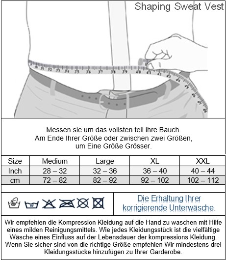 Das Shaping Sweat Vest hat einem handlicher Reißverschluss an der Vorderseite Seite und kann in zwei Positionen mittels Haken und Ösen geschlossen werden. Die Kompression Schweiß Weste für Männer verbessert die Körperhaltung, unterstützt de Rucken korrigiert Bauch und Brust, kann diskret unter der Kleidung getragen werden und während des Sportes.