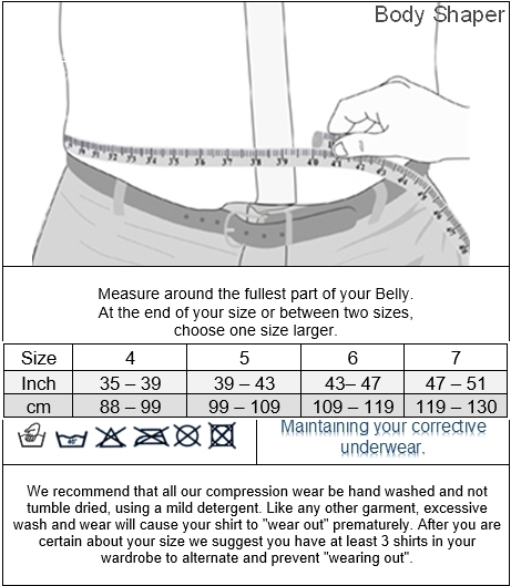 Body shaper is a reinforced strong torso shaping shirt with an additional adjustable belt around the abdomen. It hides the visible signs of skin folds (love handles), bulging belly, flabby chest (gynecomastia) and improves your posture. The Body shaper for men is a specially developed figure corrective shirt by slimshirt.com. The shirt is reinforced with strong elastic bands on the back and has an additional adjustable band around the abdomen. The shirt has very good corrective properties; it hides the visible signs of skin folds (love handles), bulging belly, flabby chest (gynecomastia) and improves your posture. The extra waistband is adjustable in three sizes, is closed with a strong hook and eye closure and reduces your waist circumference directly by 2 to 4 inches. The BodyShaper has extra wide shoulder straps and flat hemmed seams which ensure a comfortable fit. The backside of the shirt is reinforced with strong elastic straps, they support the spine and distribute the forces evenly over the entire upper body. This extra reinforcement ensures a smoother appearance and a straighter posture. The shirt is made of Spandex / Nylon and has a strong elastic honeycomb structure. The fabric is 100% stretchable in all directions and adapts perfectly to the body, without creating folds. The fabric is moisture regulating, has good breathable properties and firms the skin.
