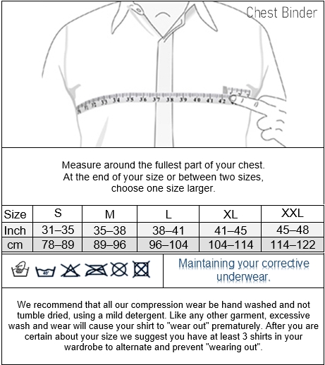 The Chest binder is easy to put on off by means of the hook and eye front closure. The top is made of two layers strong elastic Nylon Spandex, feels soft, has strong flat-seamed seams, an extra low cut-out neck and therefore does not stand out under a shirt. Wear the Chest Binder discreetly under your clothes and experience the corrective effect of this breast corrective top.