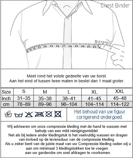 De Chest Binder is speciaal ontworpen om de zichtbare verschijnselen van (pseudo) gynaecomastie (borstvorming bij mannen) te verbergen. Ook wel Man boobs moobs genoemd. De Chest Binder wordt gesloten via een in drie maten verstelbare haak en oog sluiting en geeft alleen compressie rond de borststreek. Hierdoor wordt het borstweefsel weer teruggebracht tot normale proporties waardoor er een gladder en vlakker uiterlijk ontstaat.