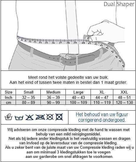De Dual Shaper is een extra sterk figuurcorrigerend shirt/ hemd voor mannen. Dit shapewear shirt is verstevigd met een uit twee lagen bestaande achterzijde en heeft een extra verstelbare band rond de buik. De extra buikweg band is in drie maten verstelbaar, wordt gesloten aan de zijkant met een sterke haak en oog sluiting en laat uw buikomvang direct afnemen. Het shirt corrigeert de borststreek, strijkt de huidplooien “Love Handels” glad en laat u er zichtbaar slanker uitzien! De Dual Shaper is extra lang, heeft zeer goede corrigerende eigenschappen en valt door de zijsluiting niet op onder uw kleding.