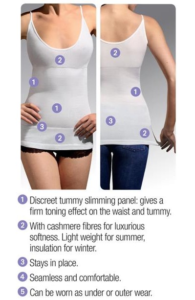 Figuurcorrigerende top met kasjmier. Met discreet figuurcorrigerend middenstuk: werkt vetkussentjes weg en verstevigt het silhouet. Met kasjmier, soepel, streelzacht en isolerend. Aangenaam fris ‘s zomers, warm in de winter. Kan als onder- of bovenkledij gedragen worden.Naadloos en comfortabel. Blijft goed zitten. | Trinny & Susannah by cette.